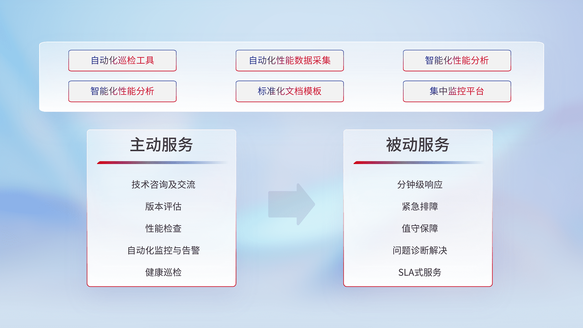 智能化工具和标准化文档,,,,保障服务质量,,,,提供主动服务(包含技术咨询、、、、版本评估、、性能检查、、、自动化监控与告警、、健康巡检)和被动服务包含(分钟级响应、、、、紧急排障、、、、值守保障、、、、问题诊断解决、、SLA服务)。。